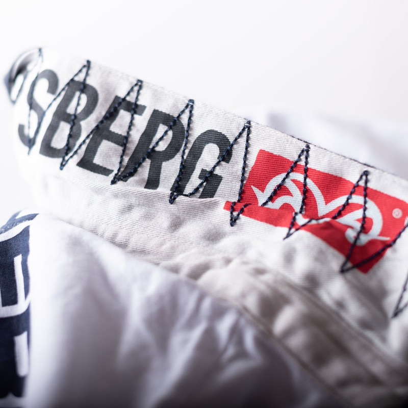 Krásny šitý detail s logom značky na dolnom ukončení trička